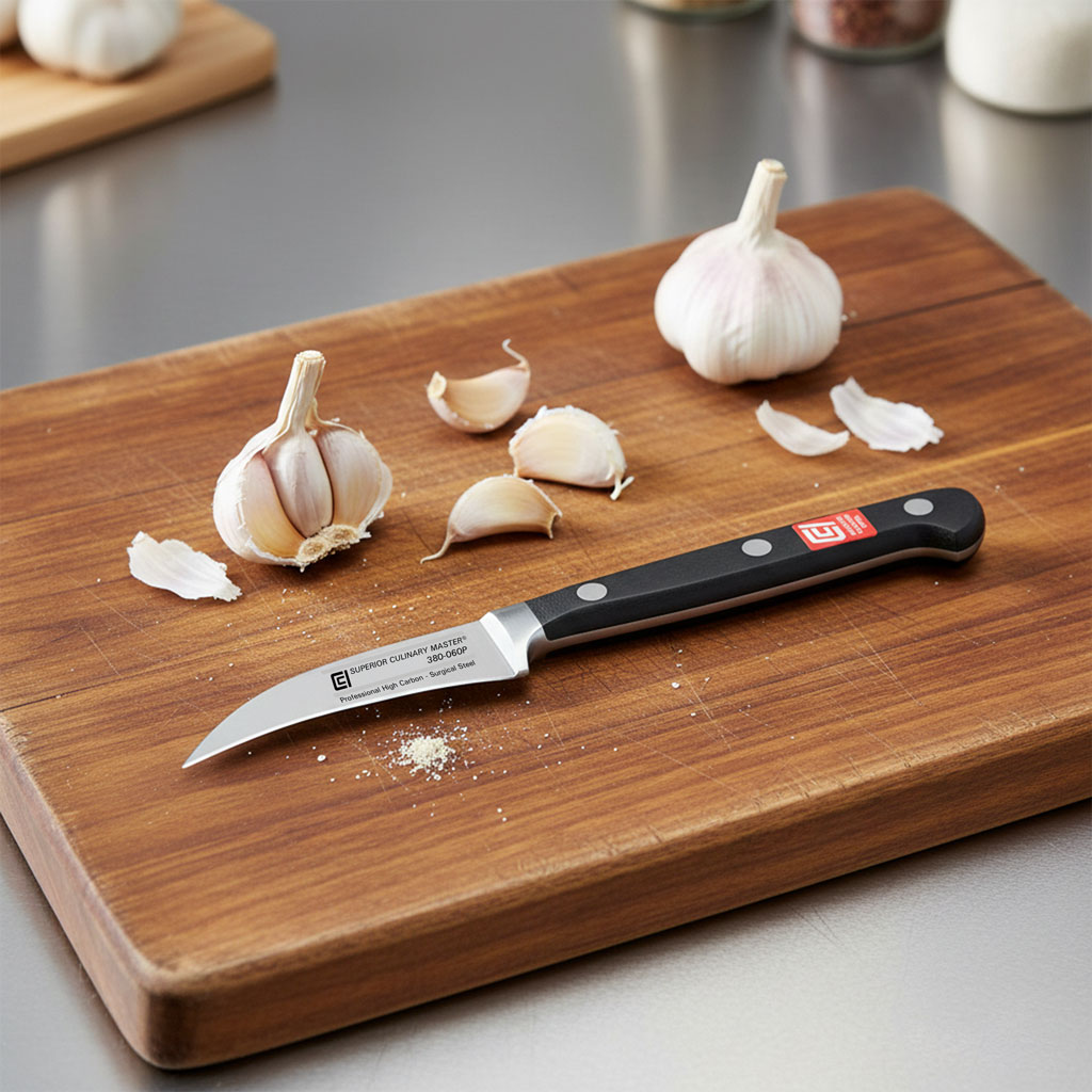 Used by the professional chef to Tourné (turn in English) vegetables, this knife is also great for removing seeds and performing other small intricate cutting jobs; the sharp point is also useful for removing the eyes of potatoes and other blemishes!  The professional chef will hold a paring knife in one hand and the item being cut in the other hand.  This knife is also known as a "bird's beak".