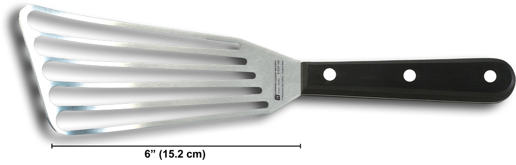 Designed for professional performance, this 6-inch stainless steel fish turner delivers the ideal balance of flexibility, durability, and control. Whether you're preparing delicate fish fillets or everyday staples, it provides the reliability chefs trust. The angled head is designed to slip easily under foods while the slots allow for fat to drain away.