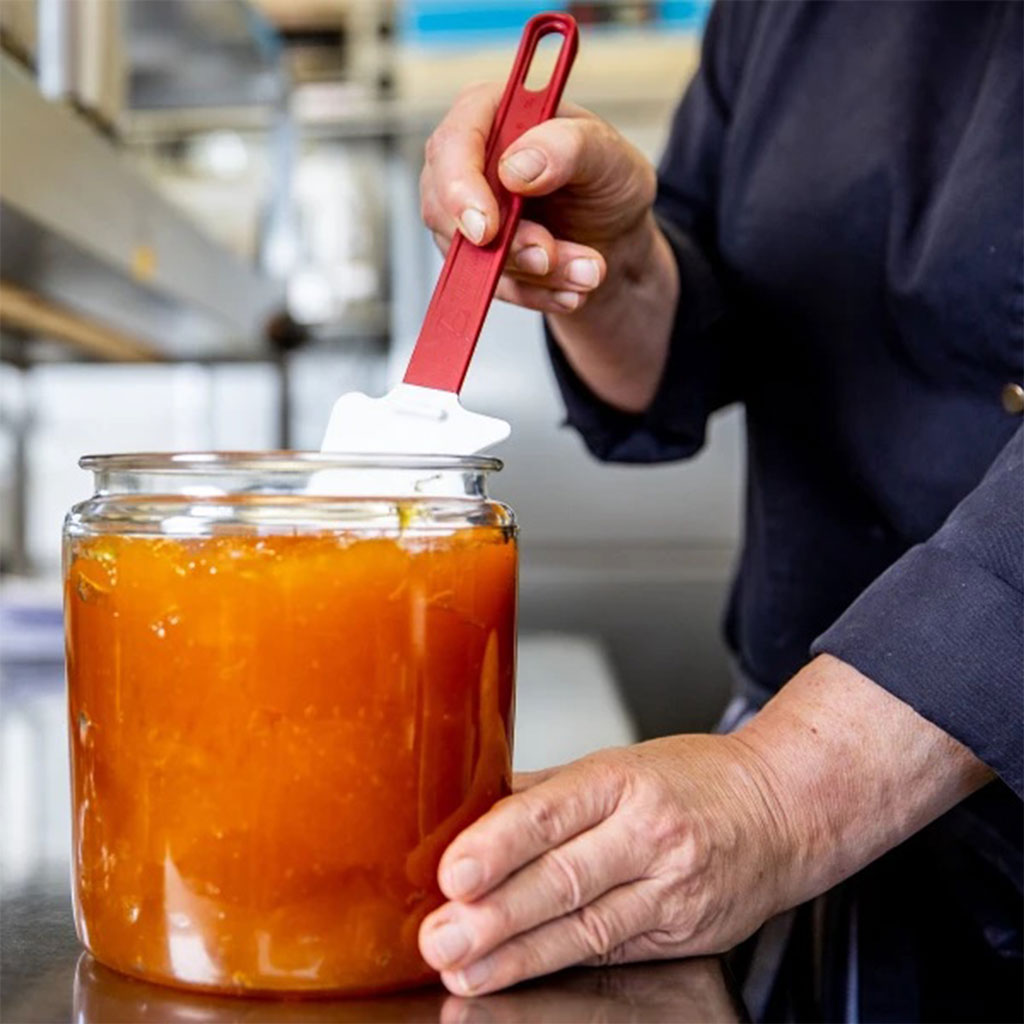 This spatula is meant for mixing sauces, icing, or other various liquids. The high temp handle allows for uses in various kitchen environments.