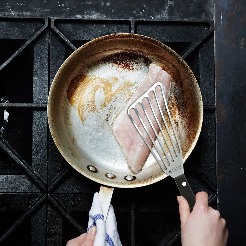 Designed for professional performance, this 6-inch stainless steel fish turner delivers the ideal balance of flexibility, durability, and control. Whether you're preparing delicate fish fillets or everyday staples, it provides the reliability chefs trust. The angled head is designed to slip easily under foods while the slots allow for fat to drain away.