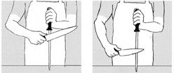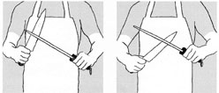 Hold the Steel firmly and away from the body. Holding the knife with the heal of the blade at the tip of the steel, draw the knife towards the handle and across the Steel, tilting the blade of the knife at an angle to the Steel. This should be repeated alternately on the front and the back of the Steel. Some users draw the blade of the knife away from the Steel handle towards the point in the belief that it is safer as per method 2.