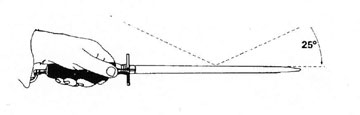 Hold the Steel vertically with the point facing downwards onto a firm, non-slip surface. Offer the knife blade to the Steel at an angle, again starting with the heal of the blade, draw the knife downwards and across the Steel. Repeat alternately on the front and back of the Steel.